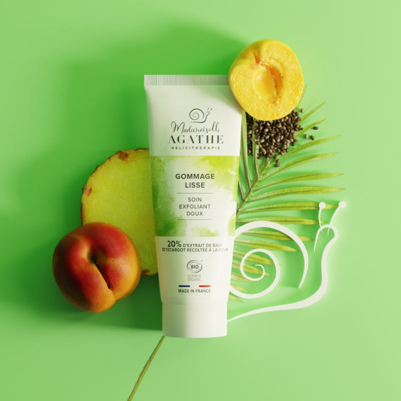 Notre gommage lisse, purifie et exfolie en douceur tous les types de peau, y compris les plus sensibles. Vous retrouverez une peau débarrassée de ses impuretés, un teint clair et une peau douce et lisse. Ce soin visage, à base de poudre de riz et de noyau d’abricot, enrichi de notre extrait de bave d’escargot, purifie et affine le grain de peau en douceur. Pour un moment de détente, appliquez une noisette de produit sur peau humide, puis massez délicatement votre visage en effectuant de petits mouvements circulaires, en évitant le contour des yeux.
