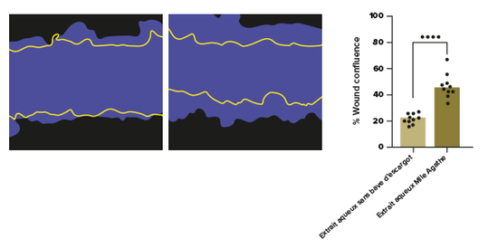 Cette étude a été menée par la Professeure Brigitte Dréno, dermato-oncologue au CHU de Nantes, et Faris Matouf, ingénieur de recherche et docteur en médecine vétérinaire, afin d’évaluer les propriétés cicatrisantes de notre extrait de bave d’escargot. Réalisée sur des kératinocytes humains (lignée HaCaT), cette étude met en évidence une stimulation significative de la régénération cellulaire :