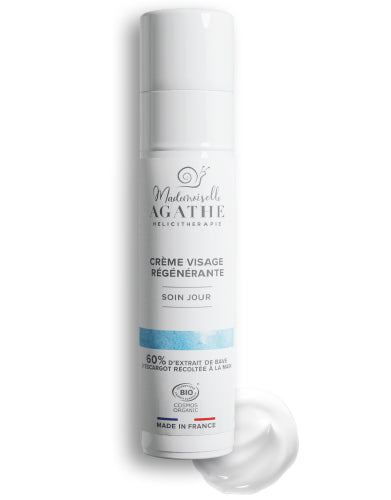 Un pur moment de plaisir tous les matins. Alliée parfaite pour tous les types de peau, la CREME REGENERANTE SOIN JOUR protège efficacement la peau contre des agressions quotidiennes de la vie moderne (pollution, fatigue, stress, variations climatiques, UVA & UVB…). Grâce à son exceptionnelle teneur en extrait de bave d’escargot (60%), reconnue pour son action stimulante dans le processus de synthèse du collagène, de l’élastine, des vitamines, et associée à un cocktail exclusif de 4 actifs rigoureusement sélectionnés, cette crème, aux propriétés hydratantes et émollientes, sera votre alliée anti-âge, jour après jour.