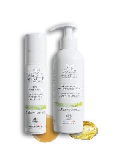 Ce duo de soins de notre gamme PURIFIER vous aidera à calmer tous les troubles cutanés liés à l’acné. Cette efficacité globale, à la fois apaisante, purifiante et réparatrice est possible grâce aux peptides antimicrobiens naturellement présents dans notre bave d’escargot. Ces actifs spécifiques ont des vertus séborégulatrices. Ce combo est donc parfait pour nettoyer, hydrater, tout en purifiant et affiner le grain de peau.