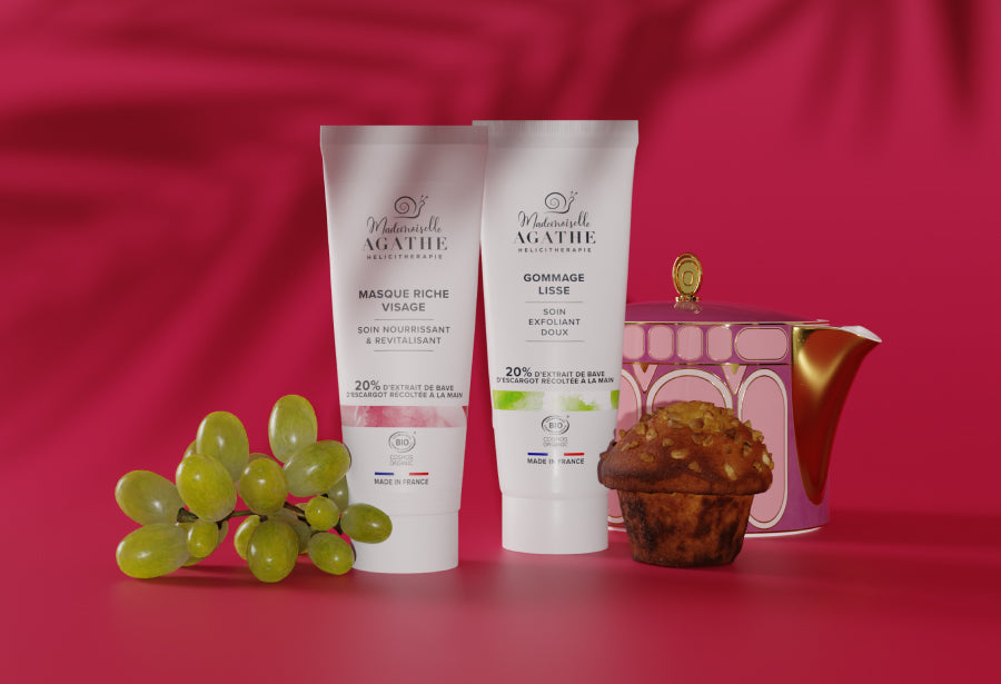 Eau, extrait de mucus d’escargot*, émollients et émulsifiants d’origine naturelle, huiles de tournesol*, poudre de grain de riz*, poudre de noyau d’abricot*, glycérine d’origine végétale, parfum 100% d’origine naturelle, vitamine E, système conservateur.
