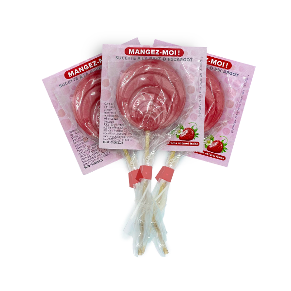 Surprenez tout le monde avec cette superbe sucette à la bave d’escargot. Rien de gluant là dedans, une bonne dose de fraise 100% naturelle, dans une sucette ronde moulée de 3.5 cm de diamètre avec quelques rayures en arrondi.